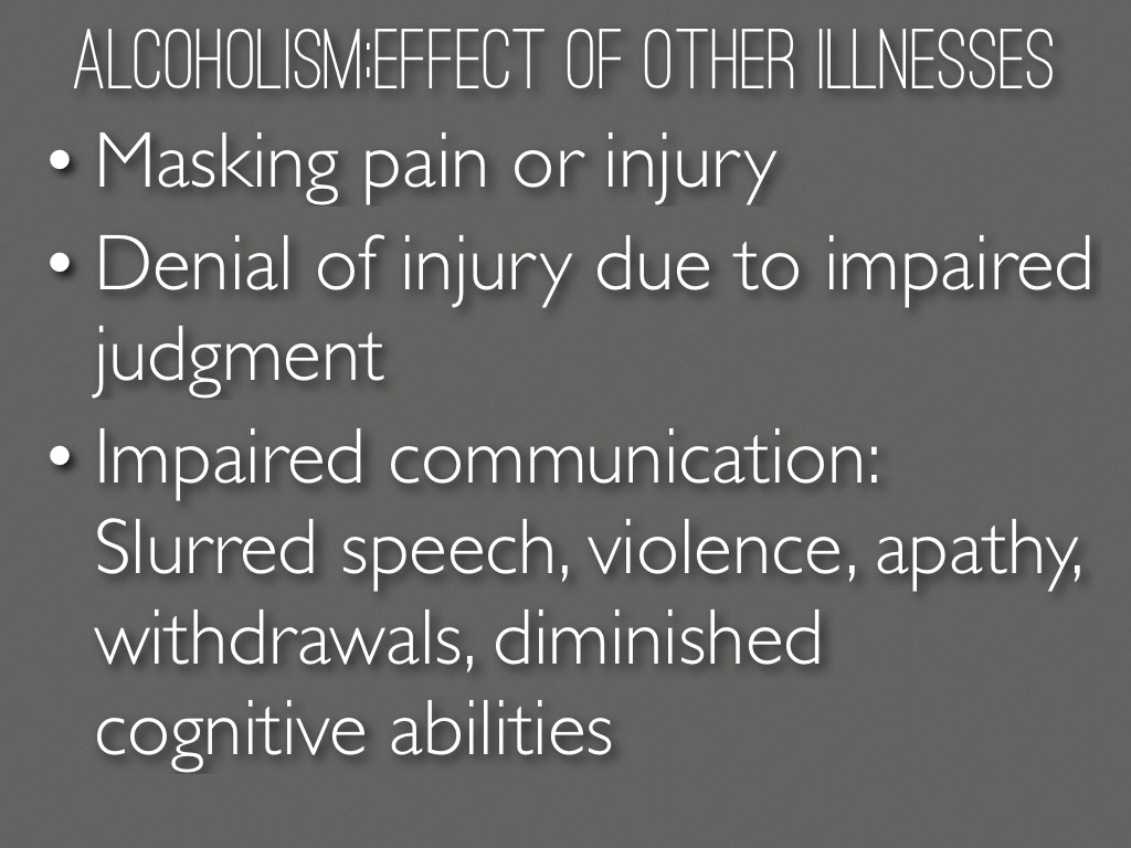 • Impaired communication: Slurred speech, violence, apathy, withdrawals, diminished cognitive abilities