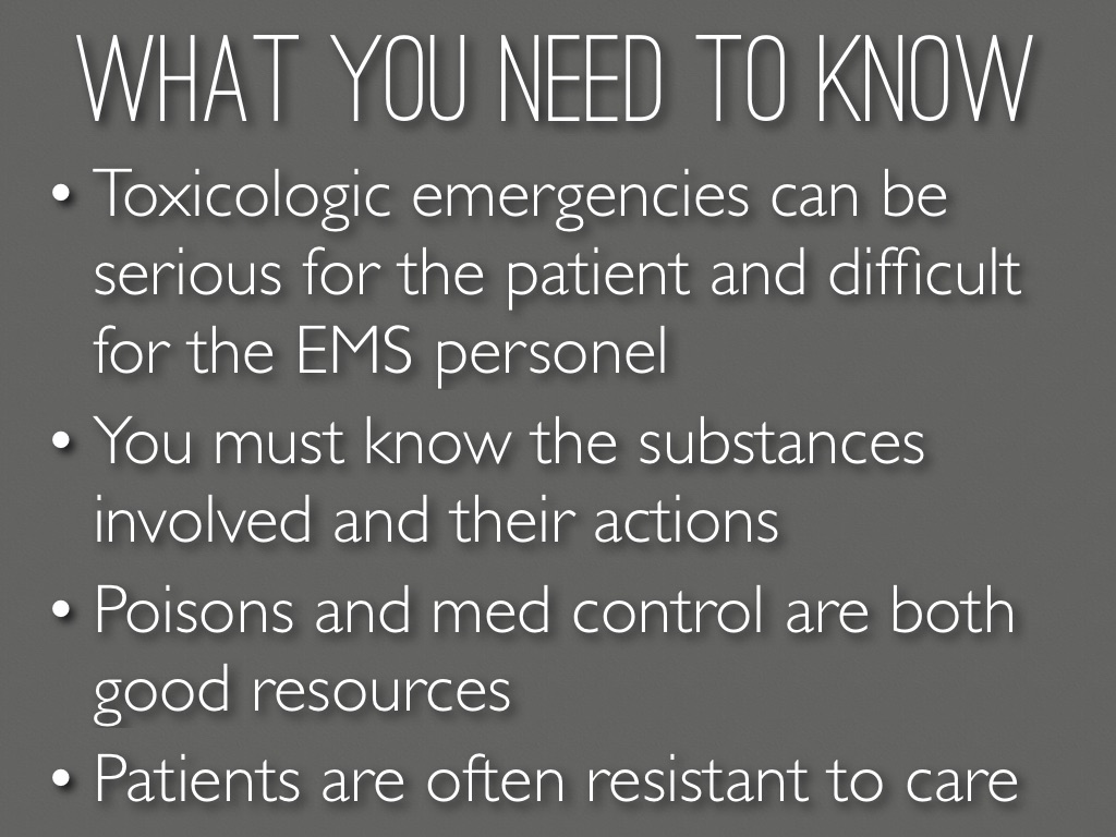 • Toxicologic emergencies can be serious for the patient and difficult for the EMS personel