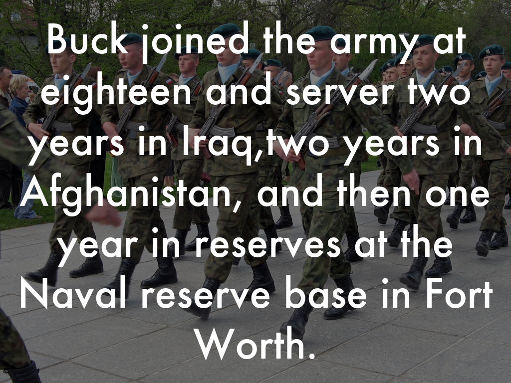 Buck joined the army at eighteen and server two years in Iraq,two years in Afghanistan, and then one year in reserves at the Naval reserve base in Fort Worth.