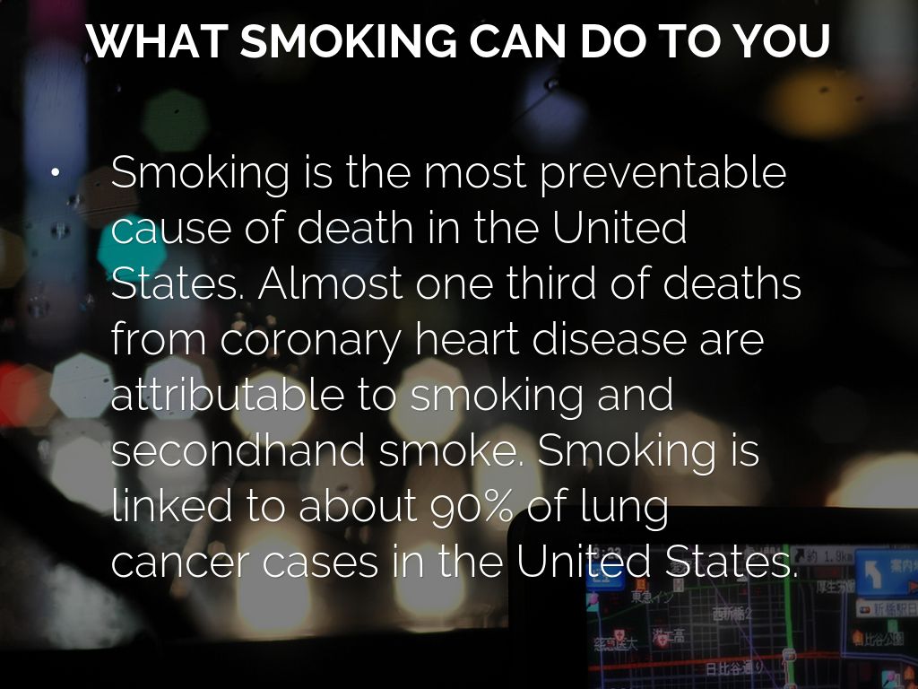 Smoking is the most preventable cause of death in the United States. Almost one third of deaths from coronary heart disease are attributable to smoking and secondhand smoke. Smoking is linked to about 90% of lung cancer cases in the United States.