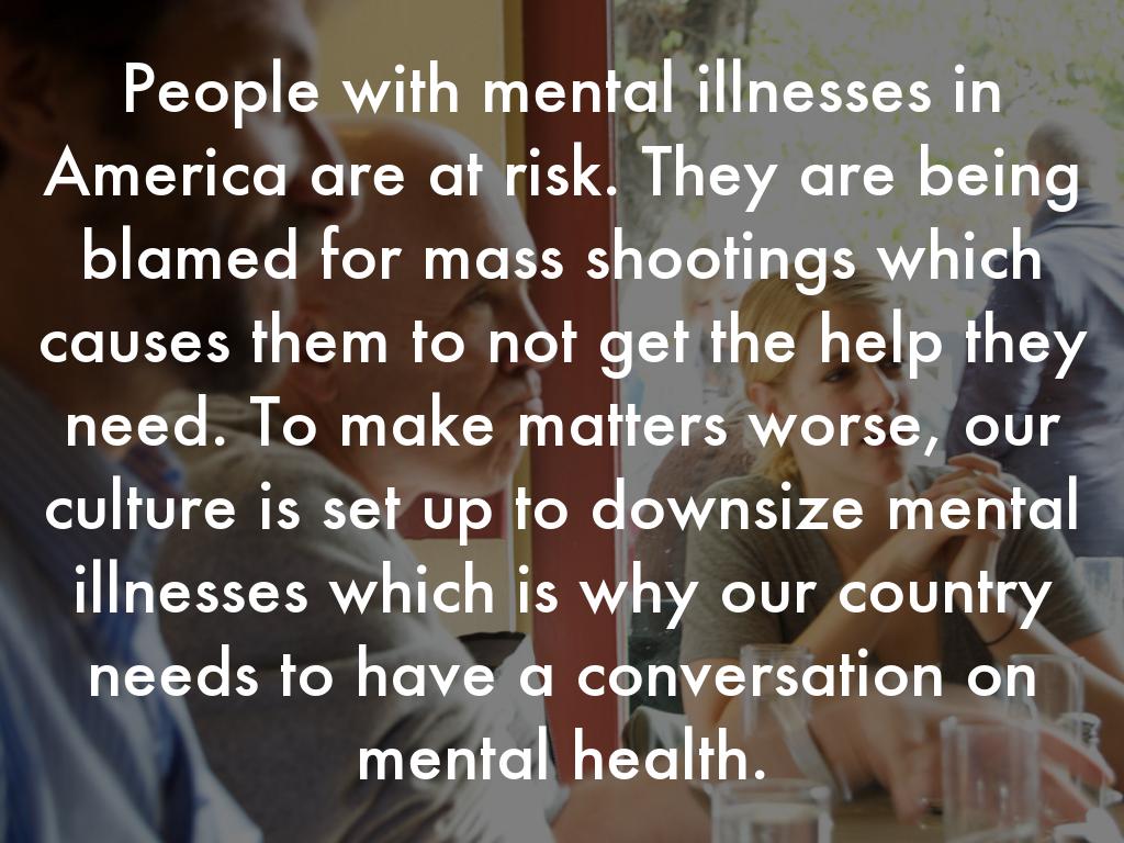 People with mental illnesses in America are at risk. They are being blamed for mass shootings which causes them to not get the help they need. To make matters worse, our culture is set up to downsize mental illnesses which is why our country needs to have a conversation on mental health.