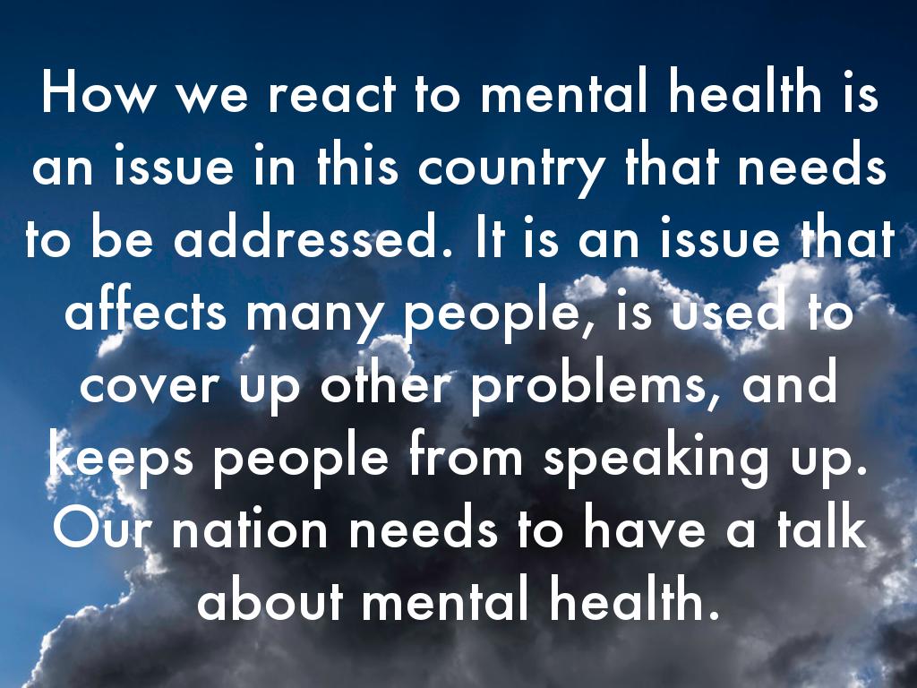 How we react to mental health is an issue in this country that needs to be addressed. It is an issue that affects many people, is used to cover up other problems, and keeps people from speaking up. Our nation needs to have a talk about mental health.