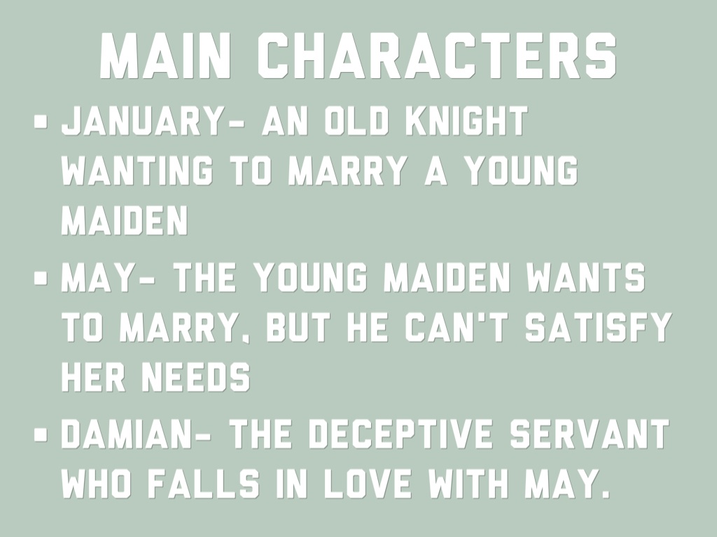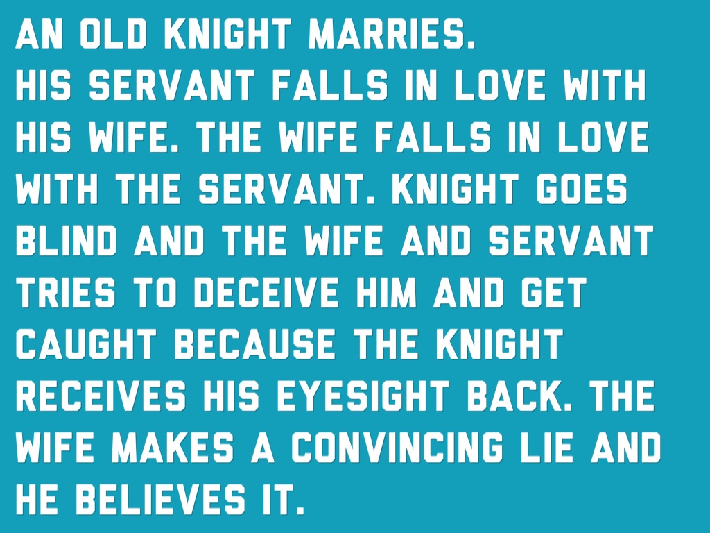His servant falls in love with his wife. the wife falls in love with the servant. Knight goes blind and the wife and servant tries to deceive him and get caught because the knight receives his eyesight back. The wife makes a convincing lie and he believes it.