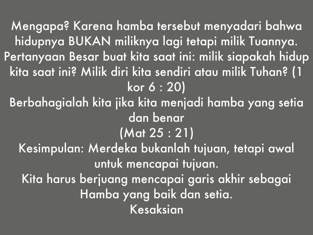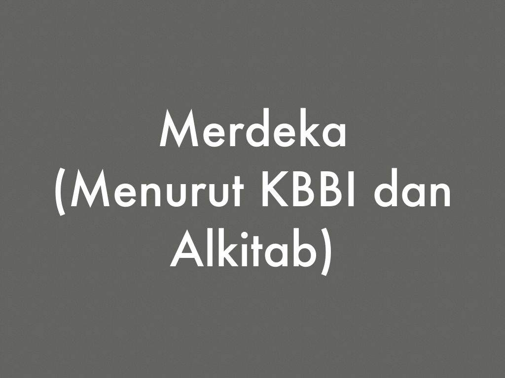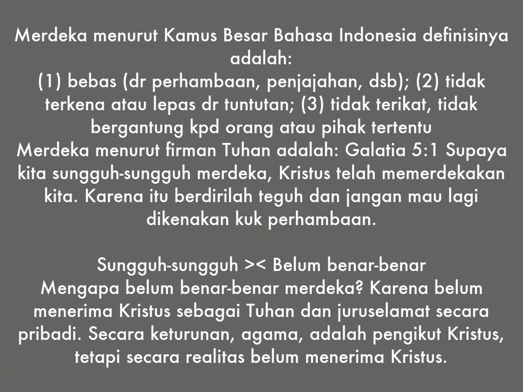 Merdeka menurut firman Tuhan adalah: Galatia 5:1 Supaya kita sungguh-sungguh merdeka, Kristus telah memerdekakan kita. Karena itu berdirilah teguh dan jangan mau lagi dikenakan kuk perhambaan.