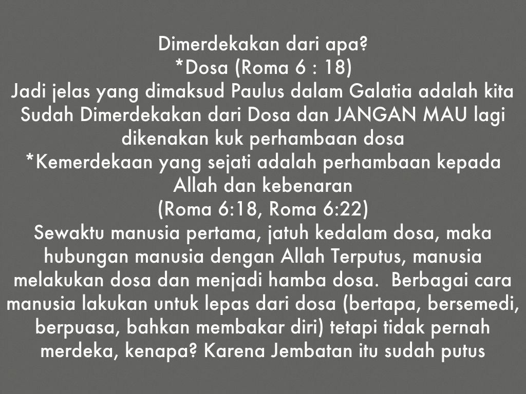 Jadi jelas yang dimaksud Paulus dalam Galatia adalah kita Sudah Dimerdekakan dari Dosa dan JANGAN MAU lagi dikenakan kuk perhambaan dosa