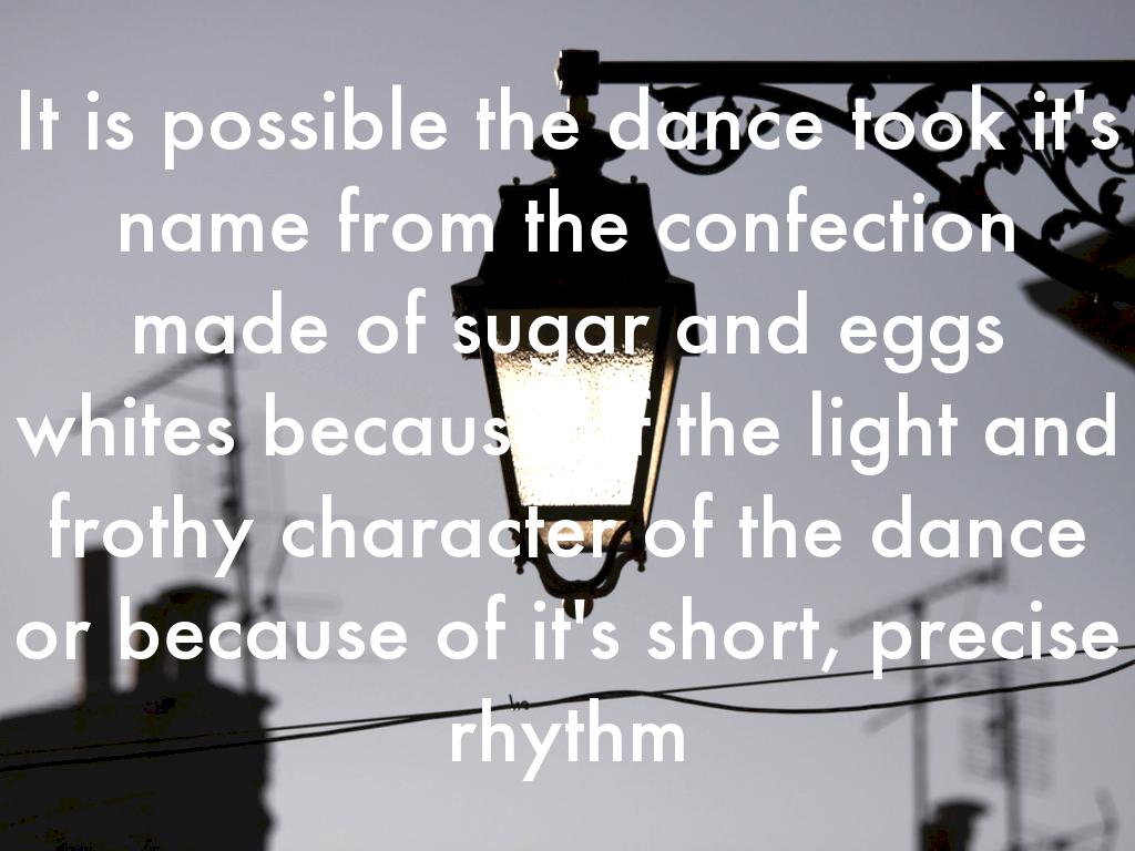 It is possible the dance took it's name from the confection made of sugar and eggs whites because of the light and frothy character of the dance or because of it's short, precise rhythm