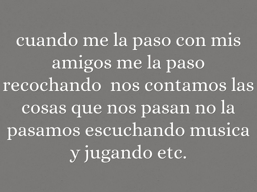 cuando me la paso con mis amigos me la paso recochando nos contamos las cosas que nos pasan no la pasamos escuchando musica y jugando etc.