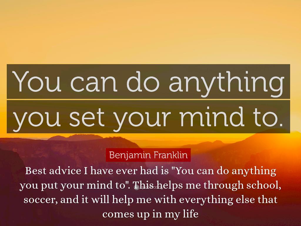 Best advice I have ever had is "You can do anything you put your mind to". This helps me through school, soccer, and it will help me with everything else that comes up in my life