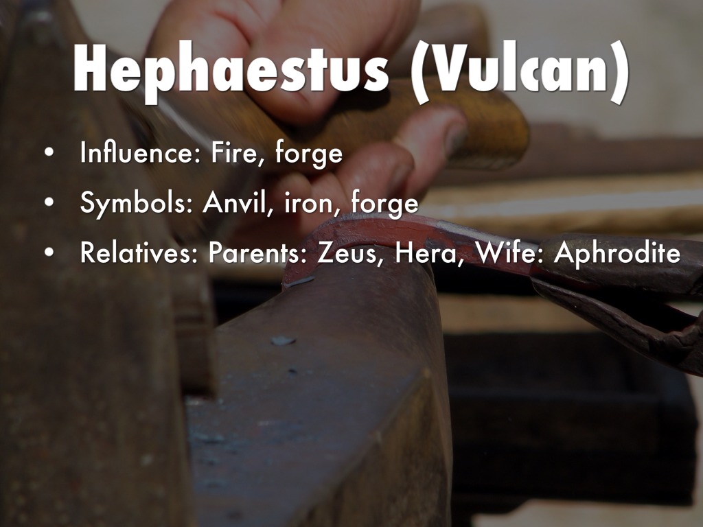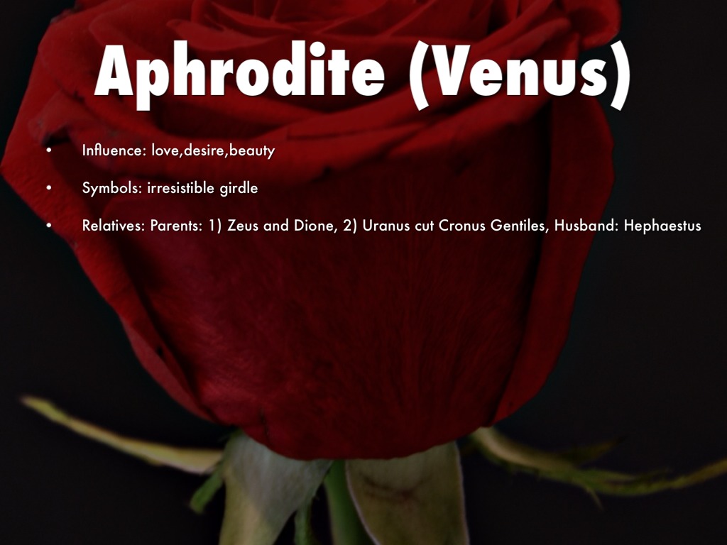 Relatives: Parents: 1) Zeus and Dione, 2) Uranus cut Cronus Gentiles, Husband: Hephaestus