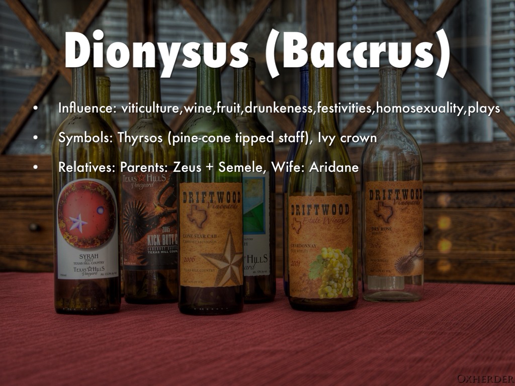Relatives: Parents: Zeus + Semele, Wife: Aridane