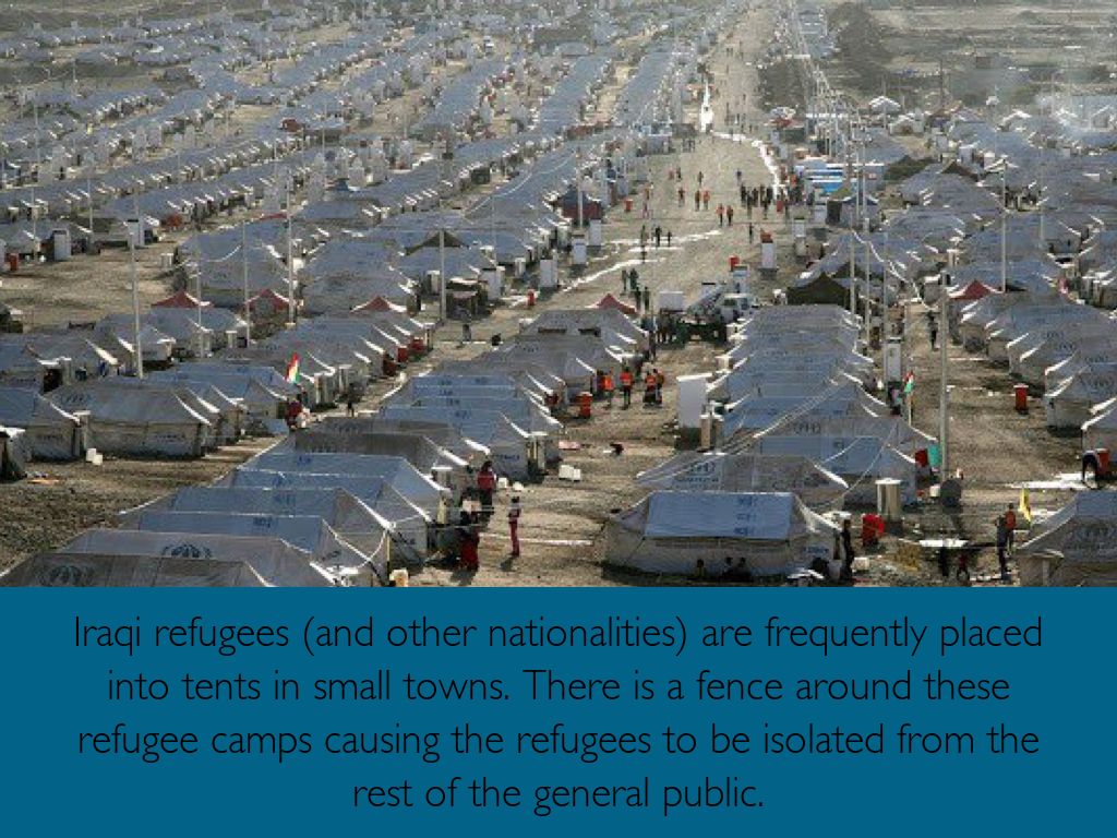 Iraqi refugees (and other nationalities) are frequently placed into tents in small towns. There is a fence around these refugee camps causing the refugees to be isolated from the rest of the general public.