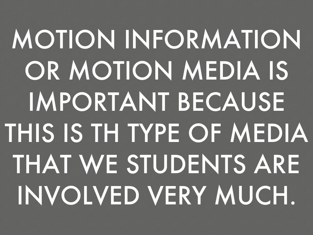MOTION INFORMATION OR MOTION MEDIA IS IMPORTANT BECAUSE THIS IS TH TYPE OF MEDIA THAT WE STUDENTS ARE INVOLVED VERY MUCH.