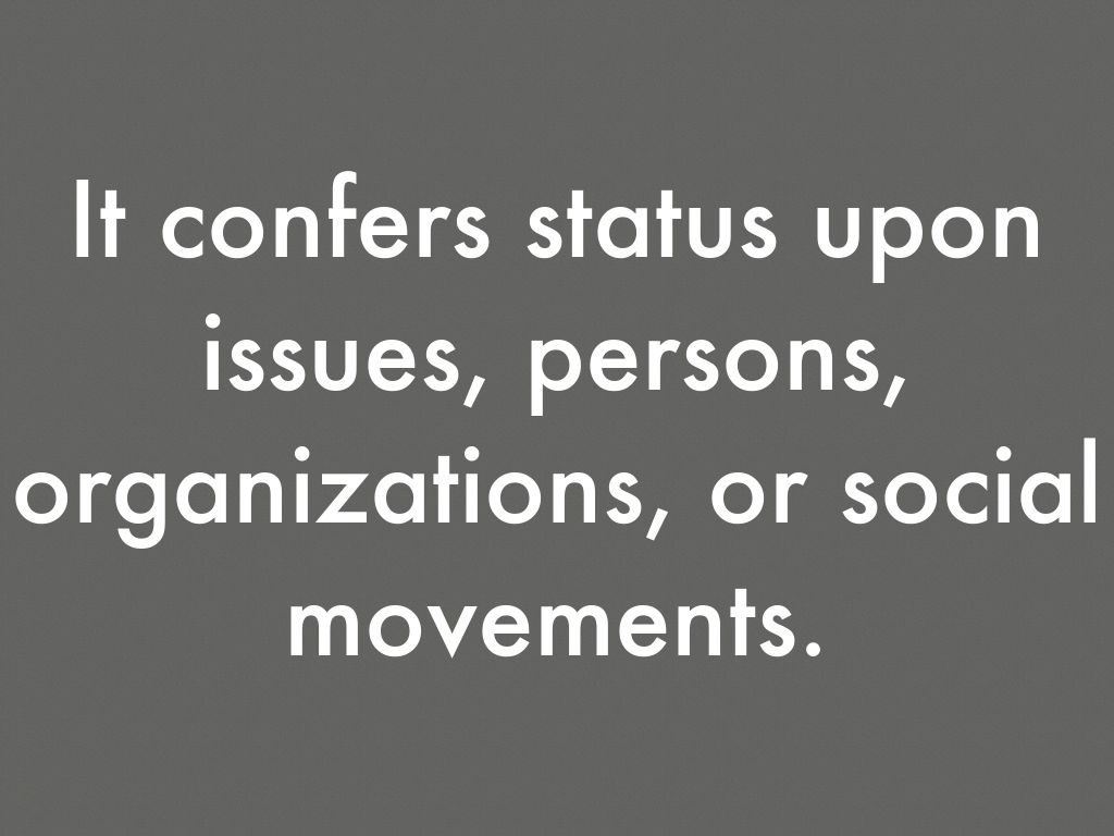 It confers status upon issues, persons, organizations, or social movements.