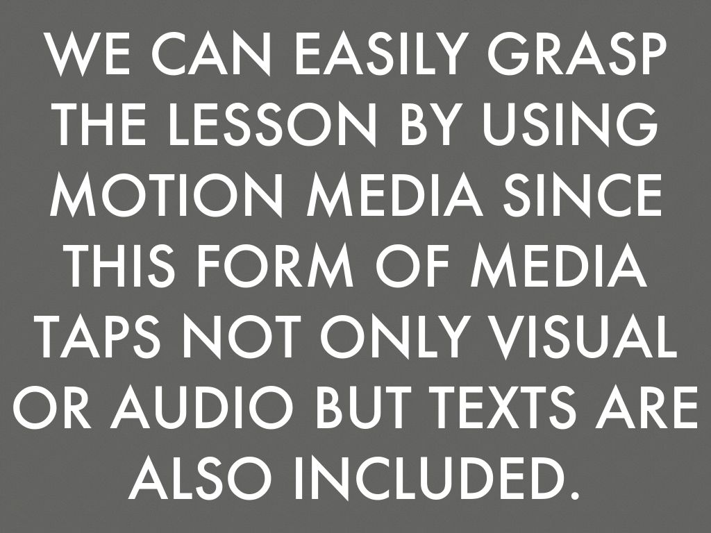 WE CAN EASILY GRASP THE LESSON BY USING MOTION MEDIA SINCE THIS FORM OF MEDIA TAPS NOT ONLY VISUAL OR AUDIO BUT TEXTS ARE ALSO INCLUDED.