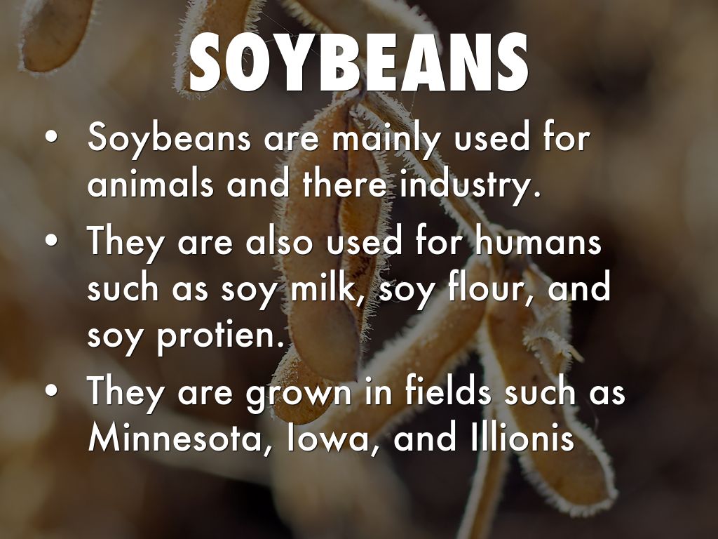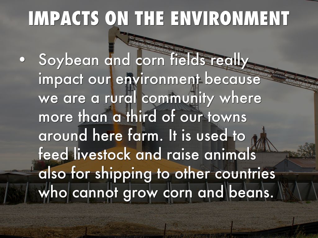 Soybean and corn fields really impact our environment because we are a rural community where more than a third of our towns around here farm. It is used to feed livestock and raise animals also for shipping to other countries who cannot grow corn and beans.