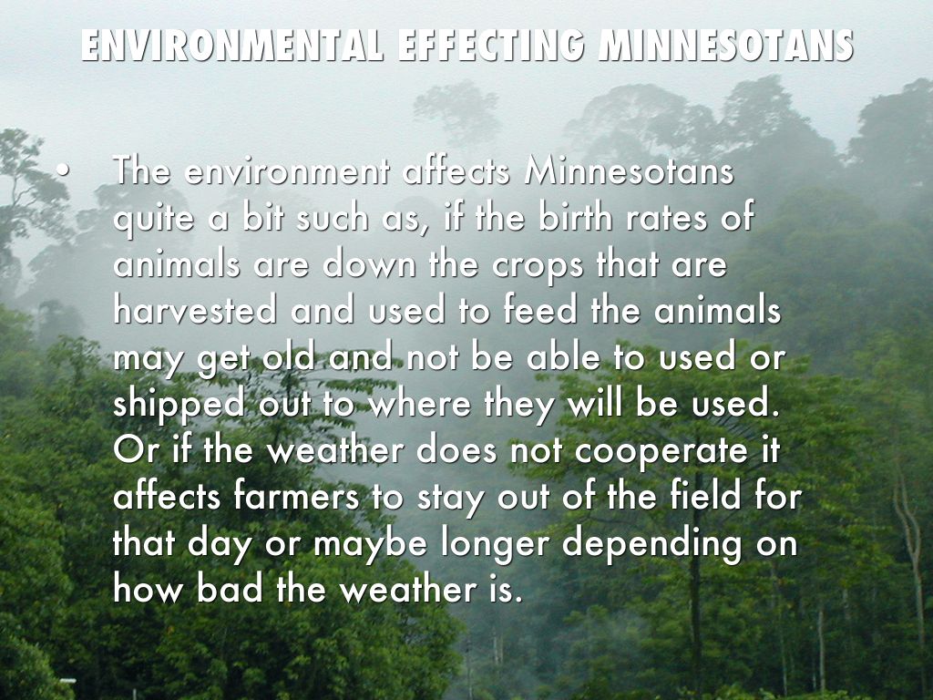 The environment affects Minnesotans quite a bit such as, if the birth rates of animals are down the crops that are harvested and used to feed the animals may get old and not be able to used or shipped out to where they will be used. Or if the weather does not cooperate it affects farmers to stay out of the field for that day or maybe longer depending on how bad the weather is.