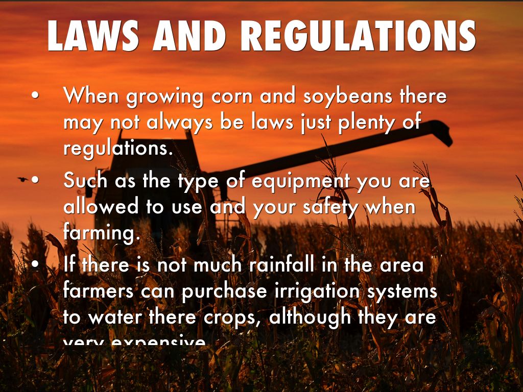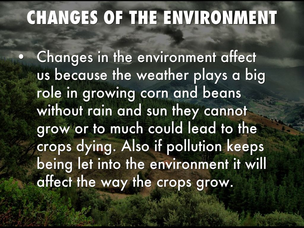 Changes in the environment affect us because the weather plays a big role in growing corn and beans without rain and sun they cannot grow or to much could lead to the crops dying. Also if pollution keeps being let into the environment it will affect the way the crops grow.