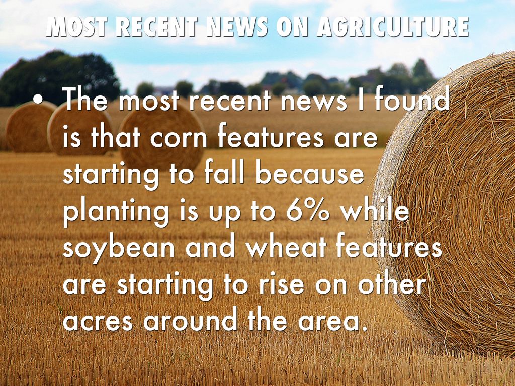 The most recent news I found is that corn features are starting to fall because planting is up to 6% while soybean and wheat features are starting to rise on other acres around the area.