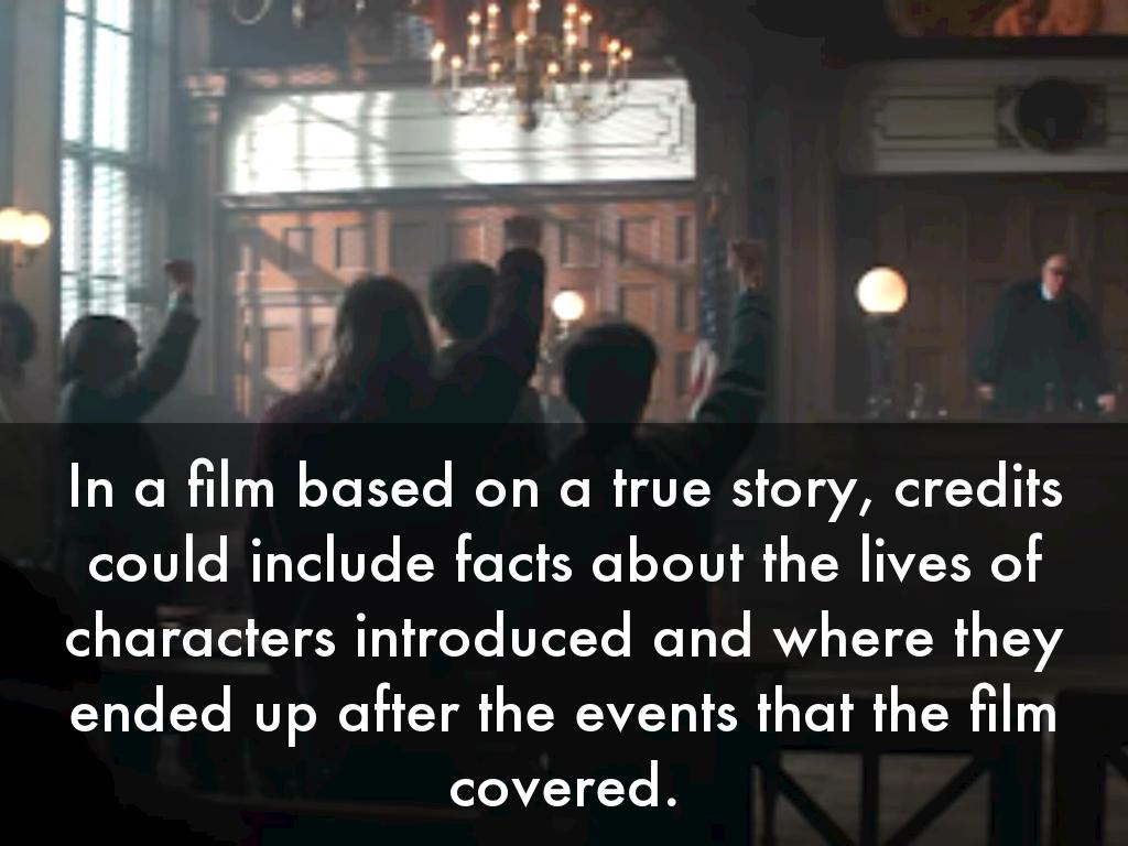 In a film based on a true story, credits could include facts about the lives of characters introduced and where they ended up after the events that the film covered.