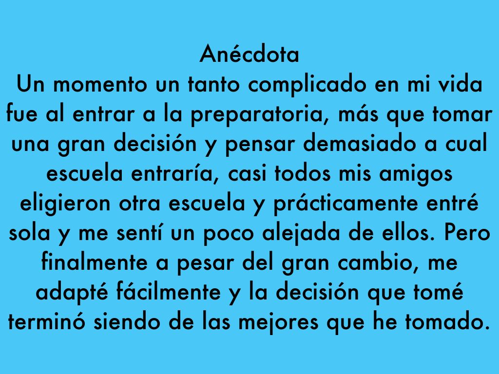 Un momento un tanto complicado en mi vida fue al entrar a la preparatoria, más que tomar una gran decisión y pensar demasiado a cual escuela entraría, casi todos mis amigos eligieron otra escuela y prácticamente entré sola y me sentí un poco alejada de ellos. Pero finalmente a pesar del gran cambio, me adapté fácilmente y la decisión que tomé terminó siendo de las mejores que he tomado.