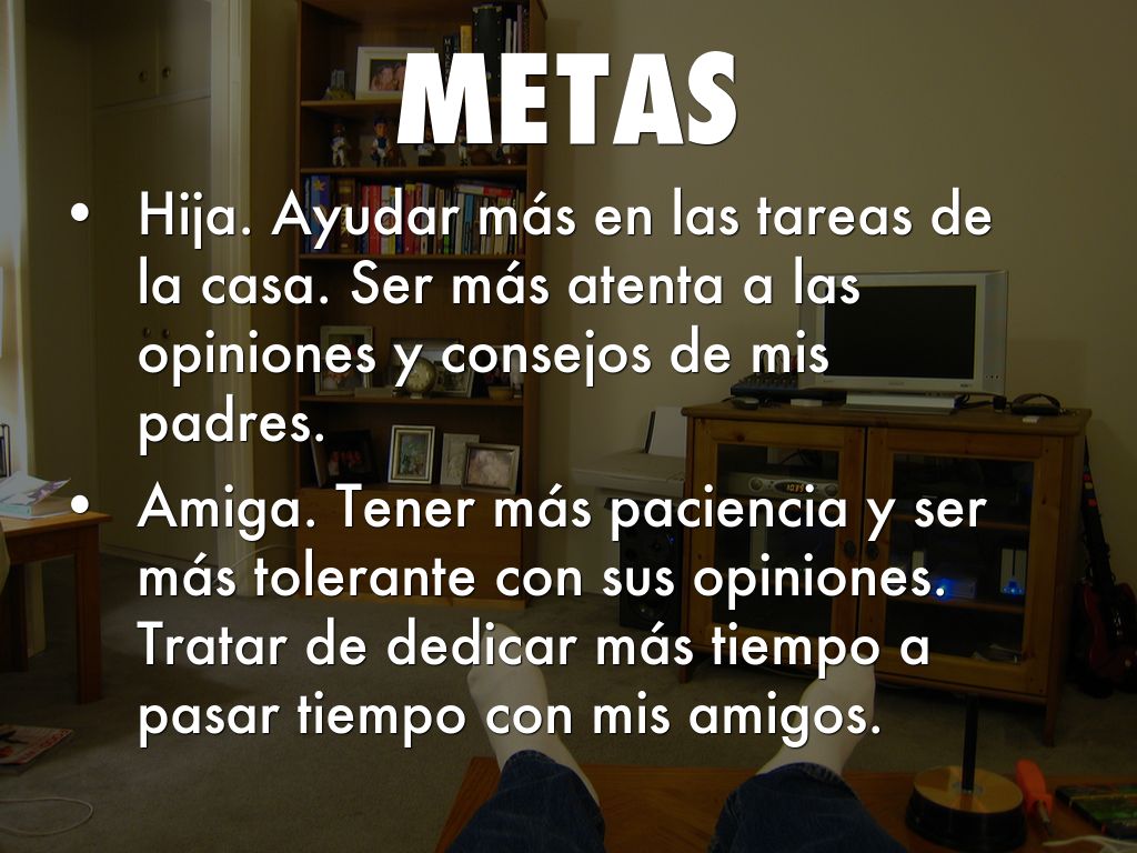 • Hija. Ayudar más en las tareas de la casa. Ser más atenta a las opiniones y consejos de mis padres.