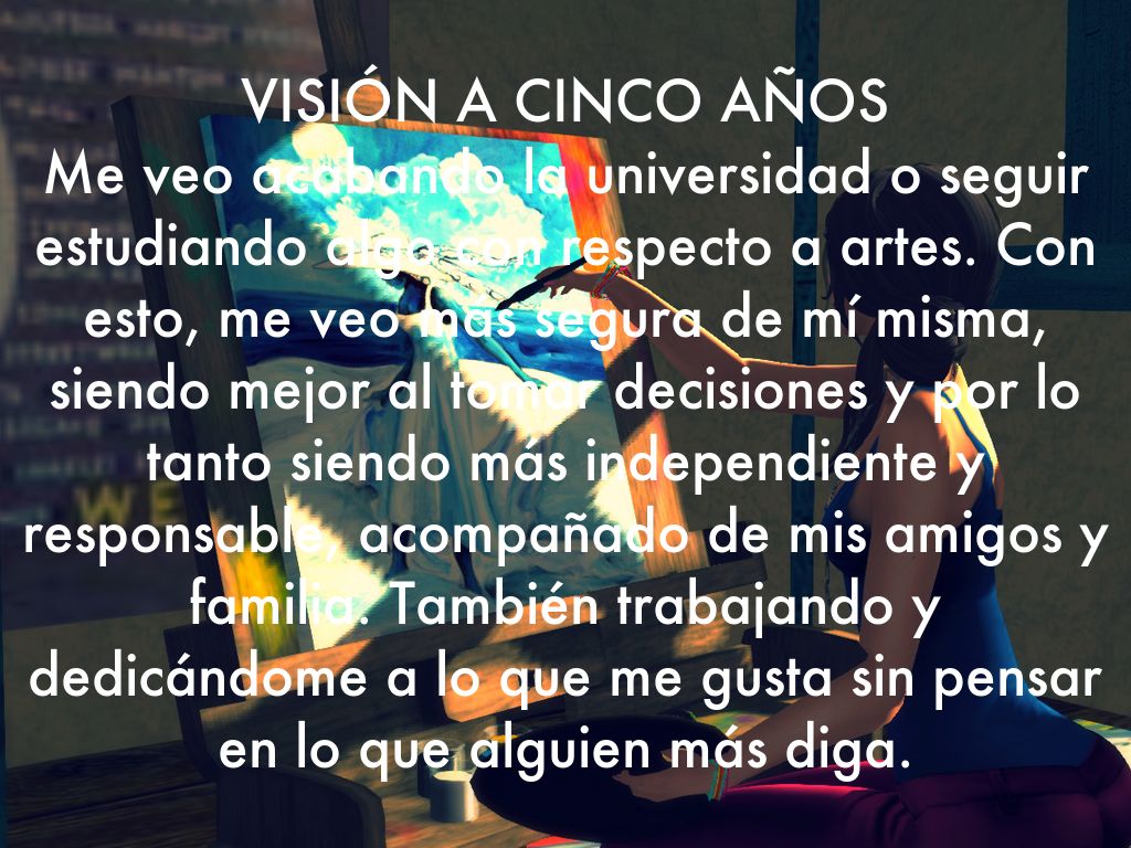 Me veo acabando la universidad o seguir estudiando algo con respecto a artes. Con esto, me veo más segura de mí misma, siendo mejor al tomar decisiones y por lo tanto siendo más independiente y responsable, acompañado de mis amigos y familia. También trabajando y dedicándome a lo que me gusta sin pensar en lo que alguien más diga.