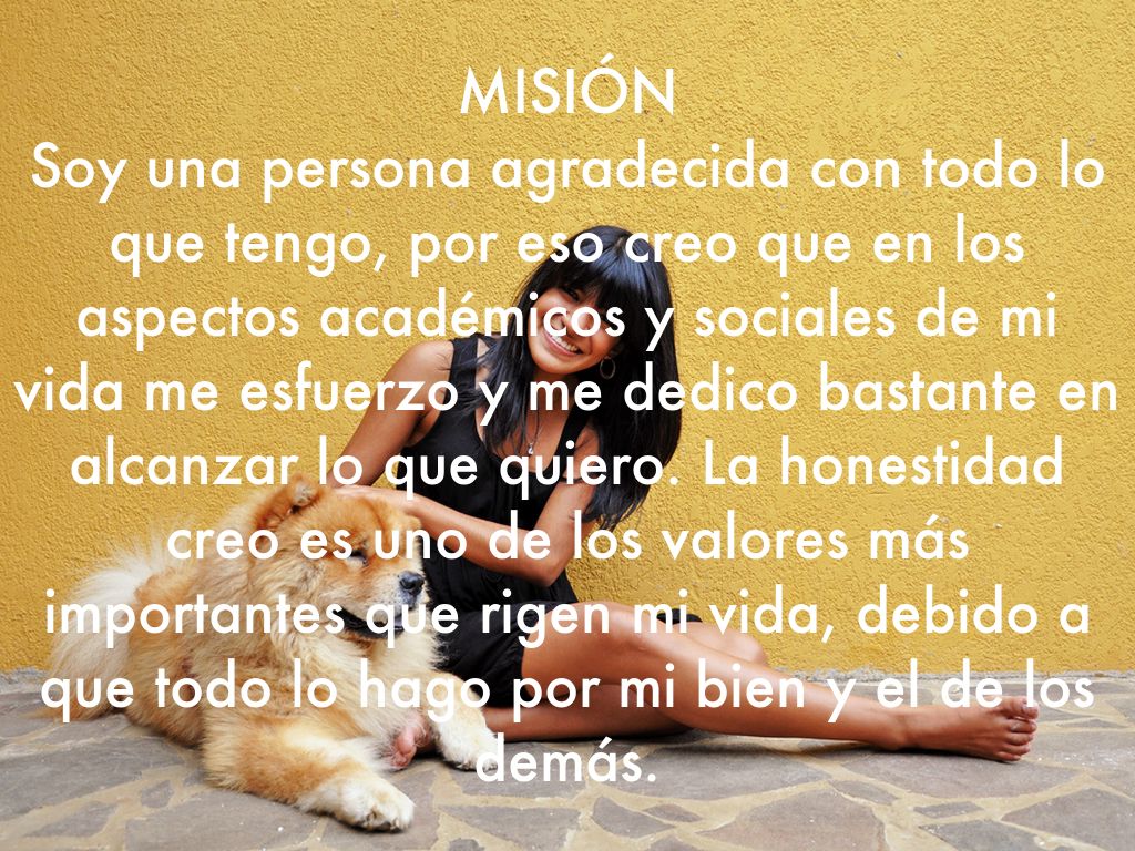 Soy una persona agradecida con todo lo que tengo, por eso creo que en los aspectos académicos y sociales de mi vida me esfuerzo y me dedico bastante en alcanzar lo que quiero. La honestidad creo es uno de los valores más importantes que rigen mi vida, debido a que todo lo hago por mi bien y el de los demás.