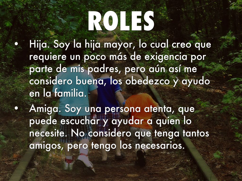 • Hija. Soy la hija mayor, lo cual creo que requiere un poco más de exigencia por parte de mis padres, pero aún así me considero buena, los obedezco y ayudo en la familia.