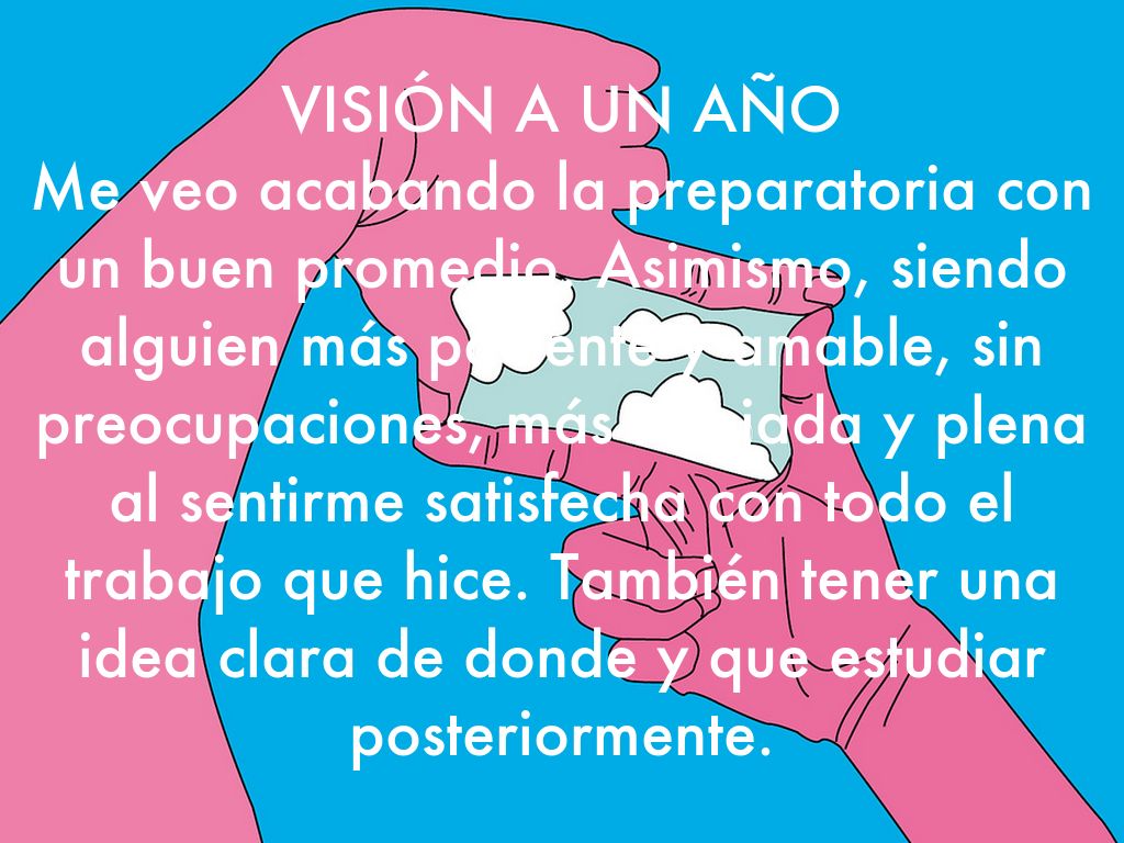 Me veo acabando la preparatoria con un buen promedio. Asimismo, siendo alguien más paciente y amable, sin preocupaciones, más relajada y plena al sentirme satisfecha con todo el trabajo que hice. También tener una idea clara de donde y que estudiar posteriormente.