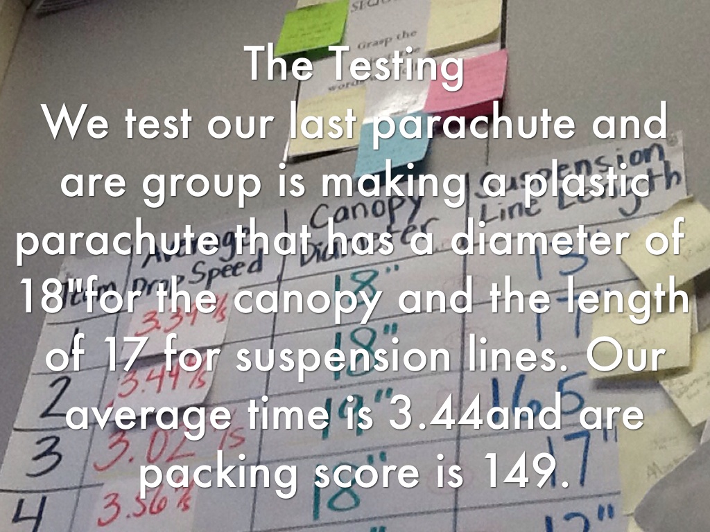 We test our last parachute and are group is making a plastic parachute that has a diameter of 18"for the canopy and the length of 17 for suspension lines. Our average time is 3.44and are packing score is 149.