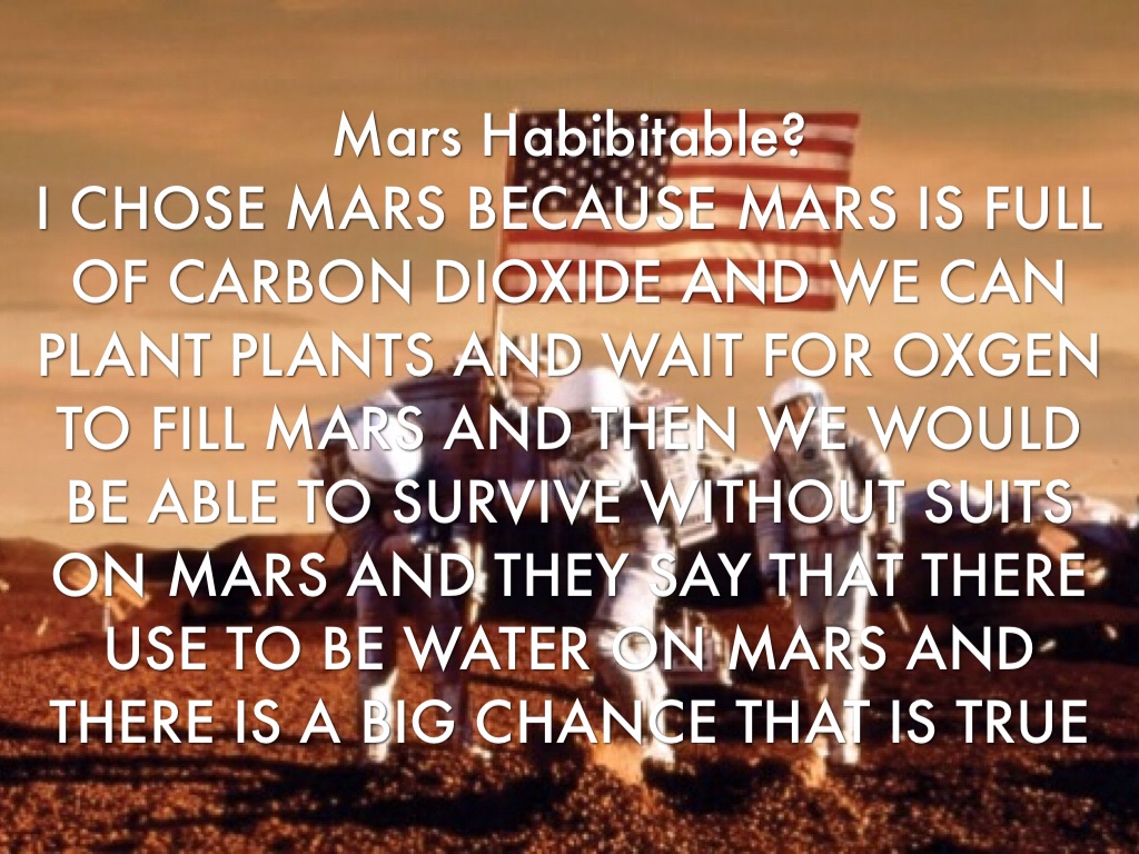 I CHOSE MARS BECAUSE MARS IS FULL OF CARBON DIOXIDE AND WE CAN PLANT PLANTS AND WAIT FOR OXGEN TO FILL MARS AND THEN WE WOULD BE ABLE TO SURVIVE WITHOUT SUITS ON MARS AND THEY SAY THAT THERE USE TO BE WATER ON MARS AND THERE IS A BIG CHANCE THAT IS TRUE