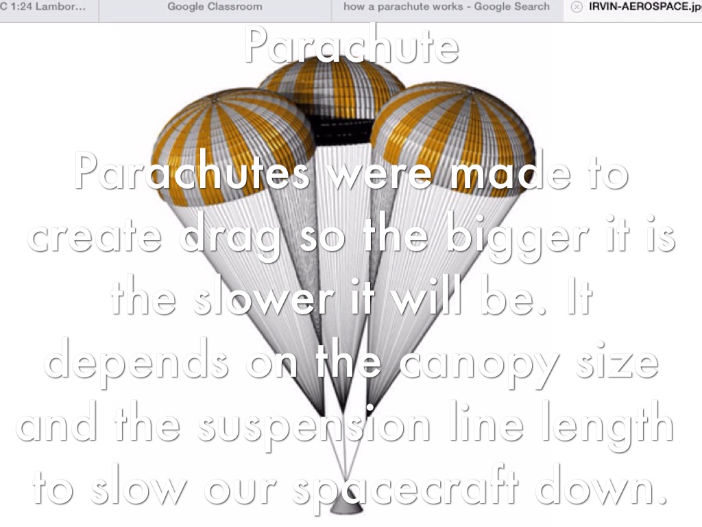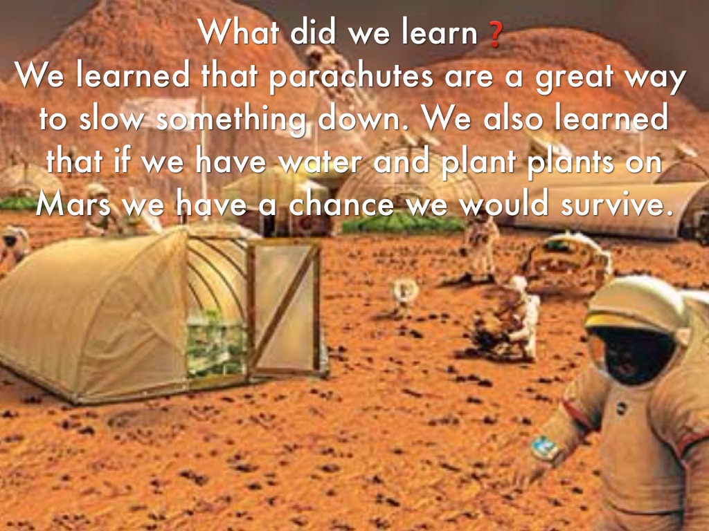 We learned that parachutes are a great way to slow something down. We also learned that if we have water and plant plants on Mars we have a chance we would survive.