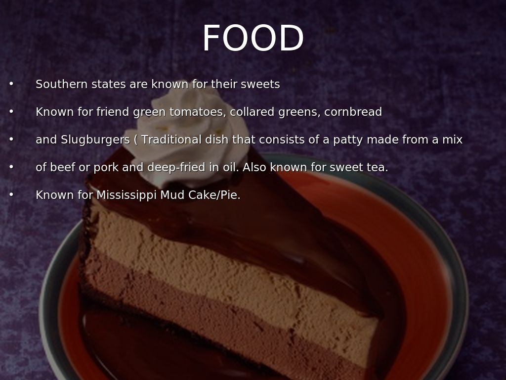 Known for Mississippi Mud Cake/Pie.