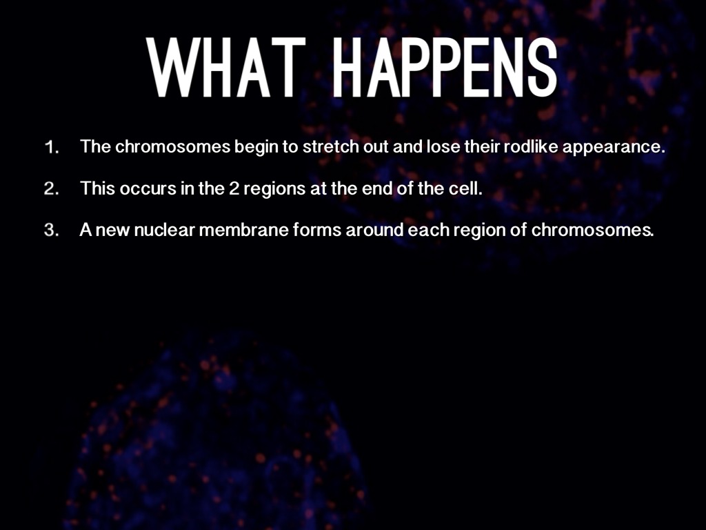 The chromosomes begin to stretch out and lose their rodlike appearance.