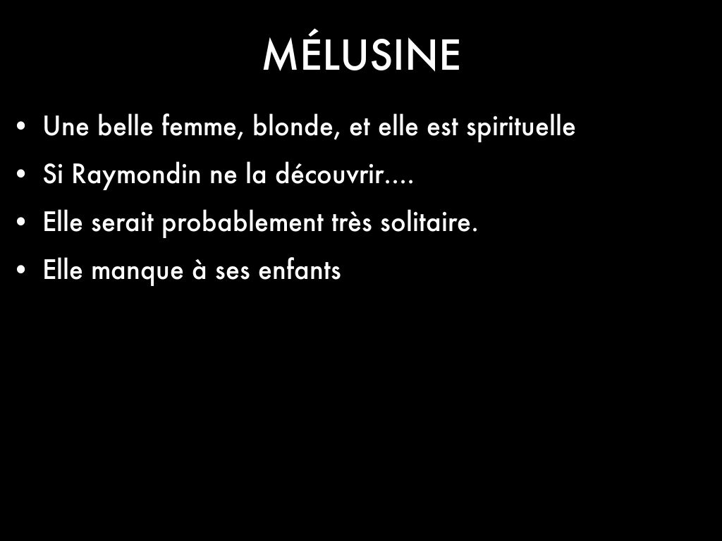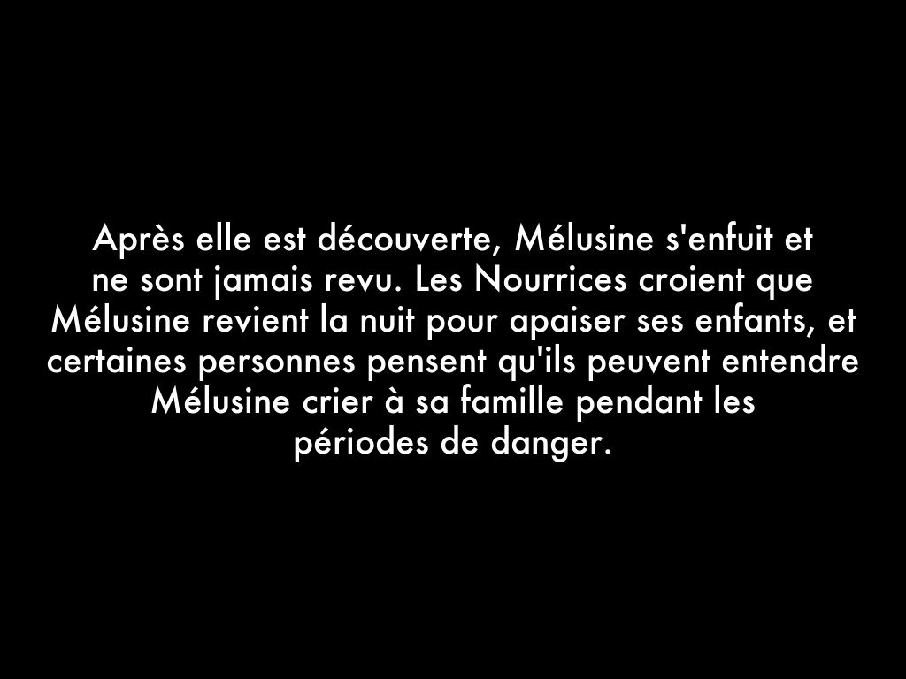 ne sont jamais revu. Les Nourrices croient que Mélusine revient la nuit pour apaiser ses enfants, et certaines personnes pensent qu'ils peuvent entendre Mélusine crier à sa famille pendant les