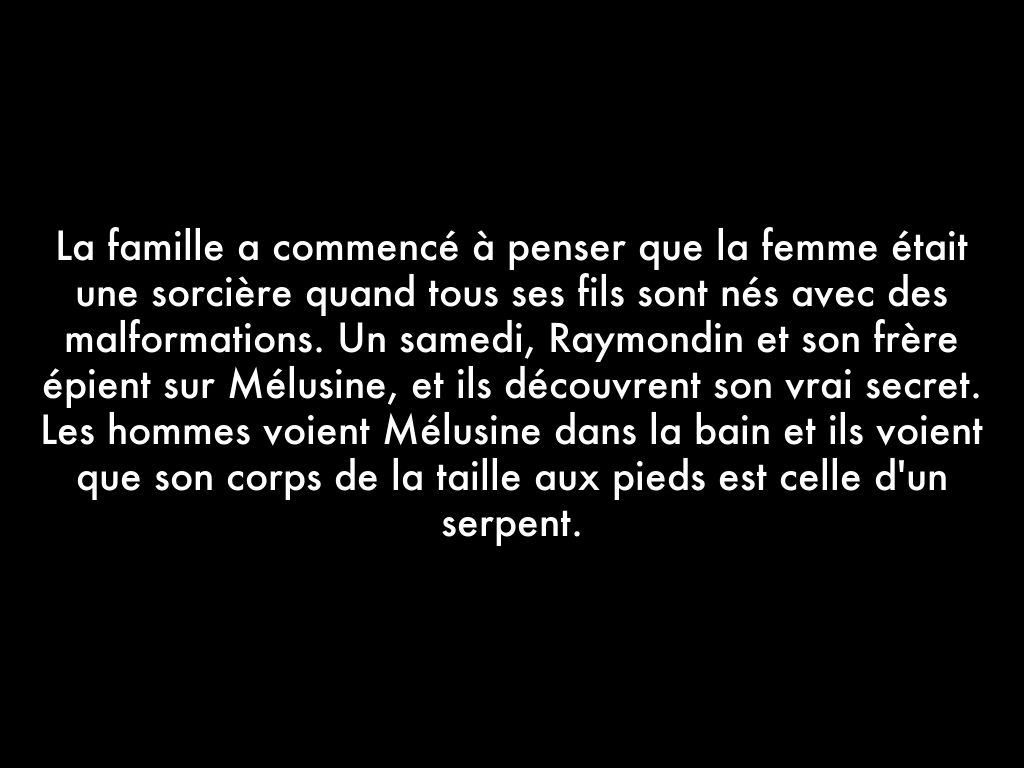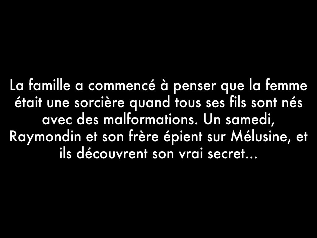 La famille a commencé à penser que la femme était une sorcière quand tous ses fils sont nés avec des malformations. Un samedi, Raymondin et son frère épient sur Mélusine, et ils découvrent son vrai secret. Les hommes voient Mélusine dans la bain et ils voient que son corps de la taille aux pieds est celle d'un serpent.