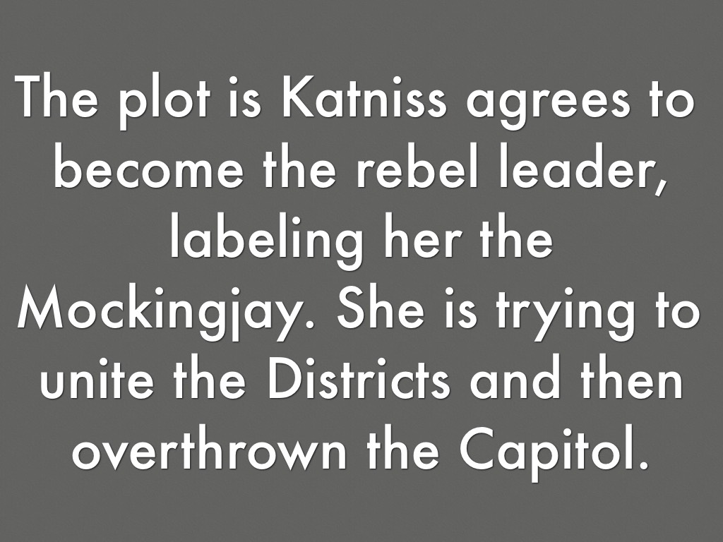 The plot is Katniss agrees to become the rebel leader, labeling her the Mockingjay. She is trying to unite the Districts and then overthrown the Capitol.