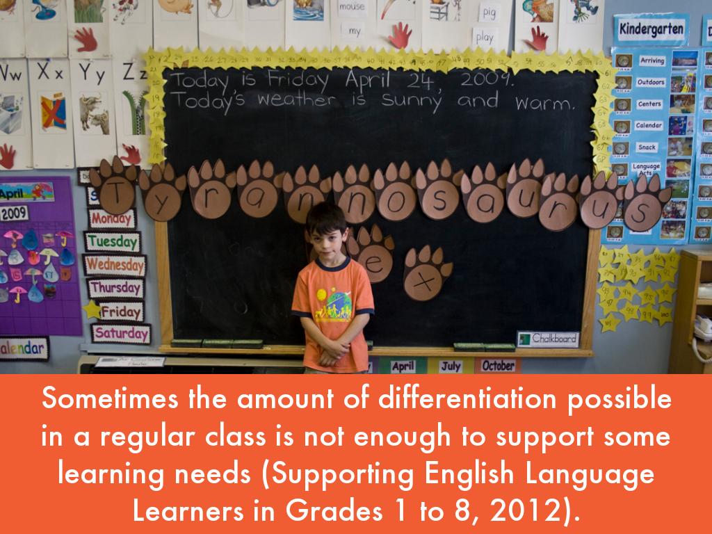 Sometimes the amount of differentiation possible in a regular class is not enough to support some learning needs (Supporting English Language Learners in Grades 1 to 8, 2012).