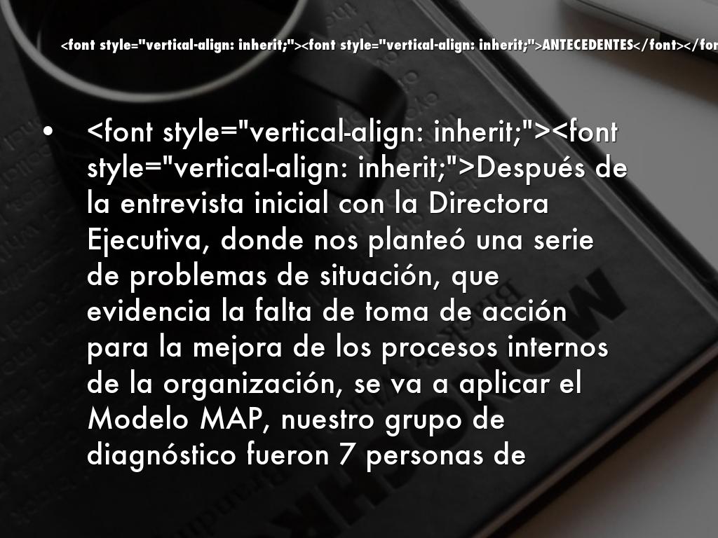 Después de la entrevista inicial con la Directora Ejecutiva, donde nos planteó una serie de problemas de situación, que evidencia la falta de toma de acción para la mejora de los procesos internos de la organización, se va a aplicar el Modelo MAP, nuestro grupo de diagnóstico fueron 7 personas de diferentes áreas tanto operativas como de dirección.