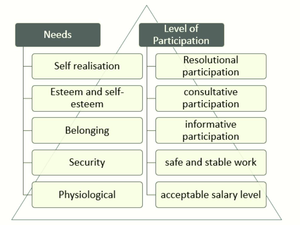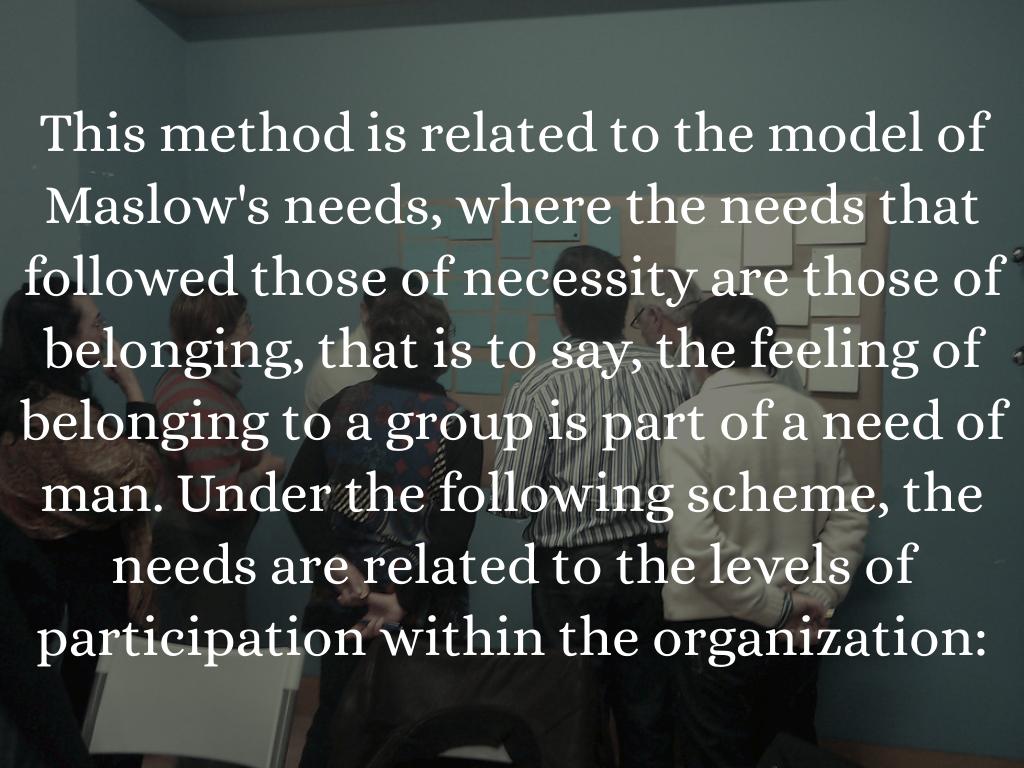 This method is related to the model of Maslow's needs, where the needs that followed those of necessity are those of belonging, that is to say, the feeling of belonging to a group is part of a need of man. Under the following scheme, the needs are related to the levels of participation within the organization: