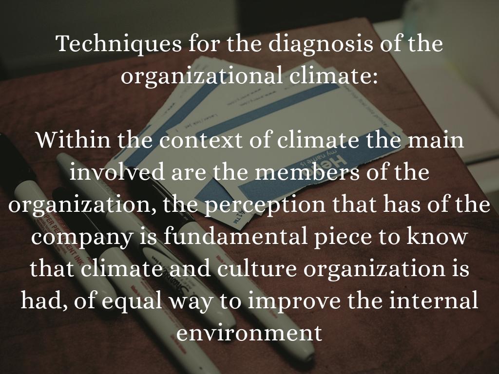Within the context of climate the main involved are the members of the organization, the perception that has of the company is fundamental piece to know that climate and culture organization is had, of equal way to improve the internal environment