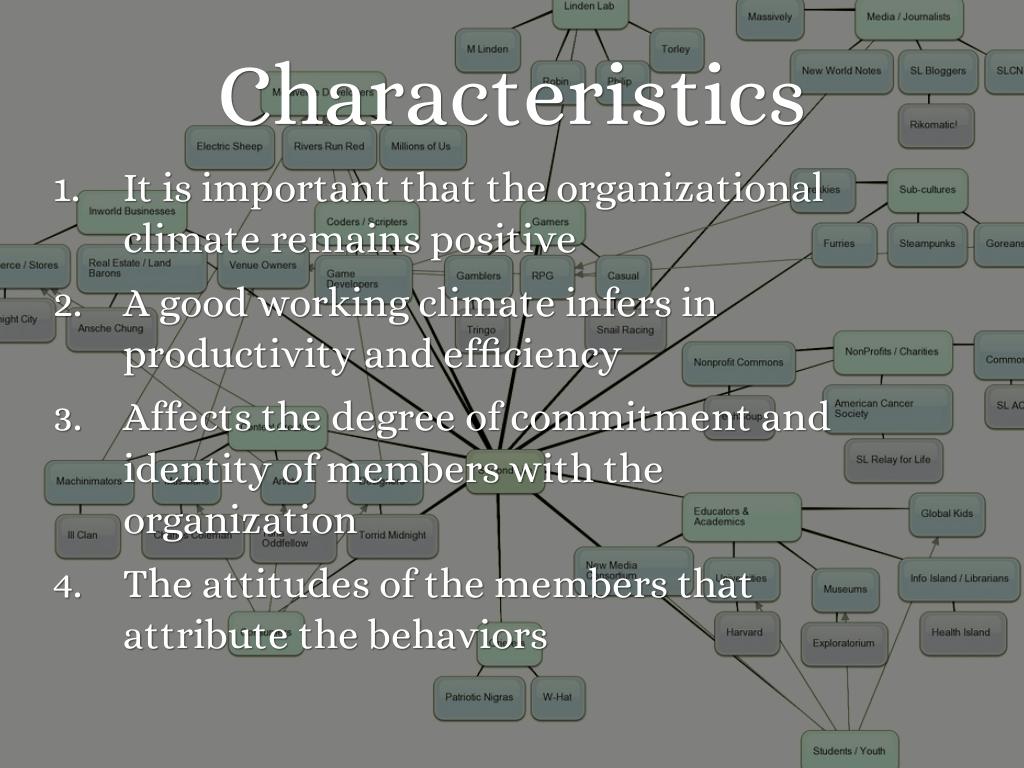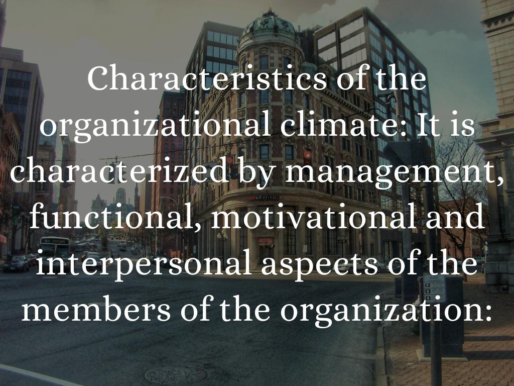 Characteristics of the organizational climate: It is characterized by management, functional, motivational and interpersonal aspects of the members of the organization: