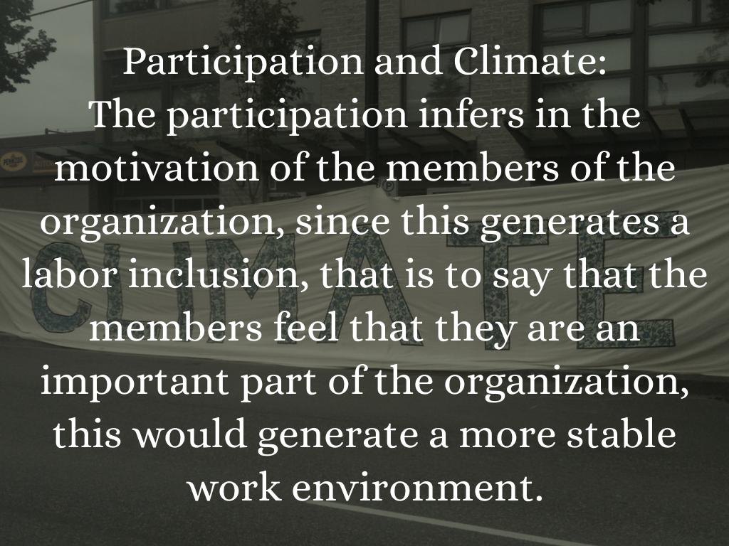 Participation and Climate: The participation infers in the motivation of the members of the organization, since this generates a labor inclusion, that is to say that the members feel that they are an important part of the organization, this would generate a more stable work environment.