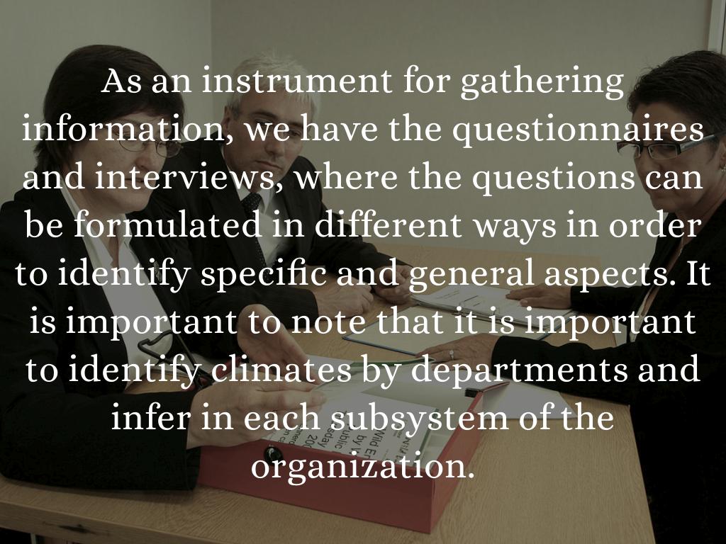 As an instrument for gathering information, we have the questionnaires and interviews, where the questions can be formulated in different ways in order to identify specific and general aspects. It is important to note that it is important to identify climates by departments and infer in each subsystem of the organization.