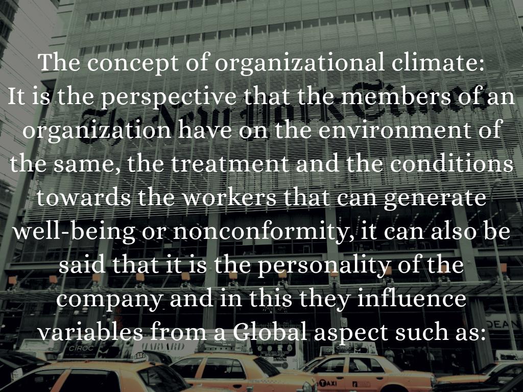 The concept of organizational climate: It is the perspective that the members of an organization have on the environment of the same, the treatment and the conditions towards the workers that can generate well-being or nonconformity, it can also be said that it is the personality of the company and in this they influence variables from a Global aspect such as: