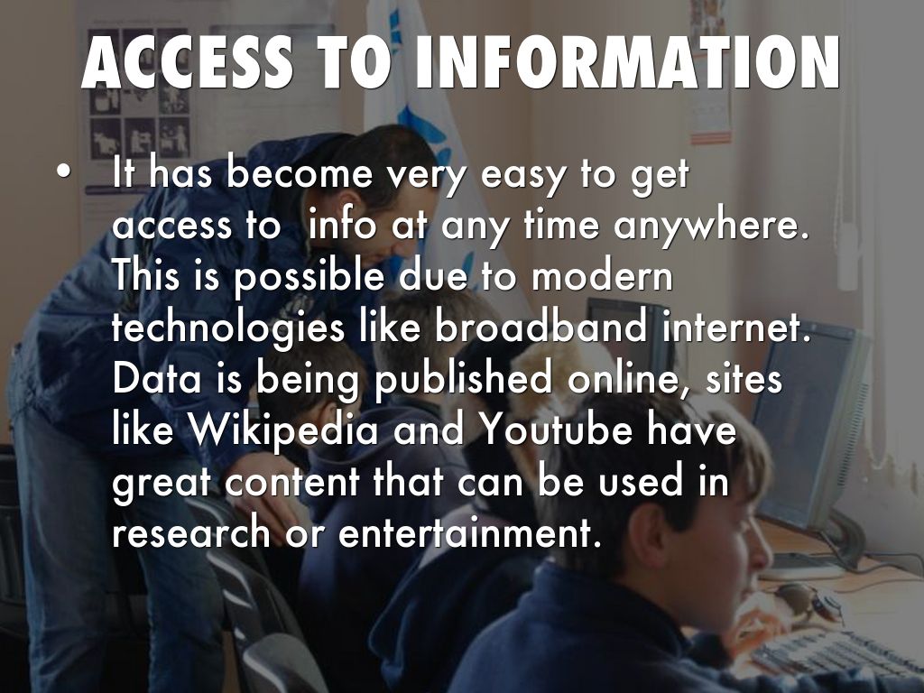 It has become very easy to get access to info at any time anywhere. This is possible due to modern technologies like broadband internet. Data is being published online, sites like Wikipedia and Youtube have great content that can be used in research or entertainment.