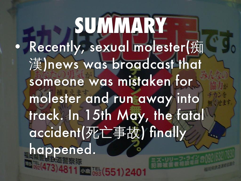 Recently, sexual molester(痴漢)news was broadcast that someone was mistaken for molester and run away into track. In 15th May, the fatal accident(死亡事故) finally happened.