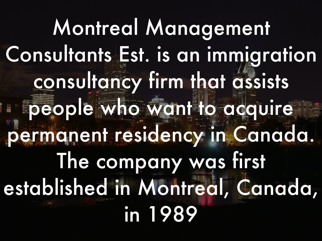 Montreal Management Consultants Est. is an immigration consultancy firm that assists people who want to acquire permanent residency in Canada. The company was first established in Montreal, Canada, in 1989