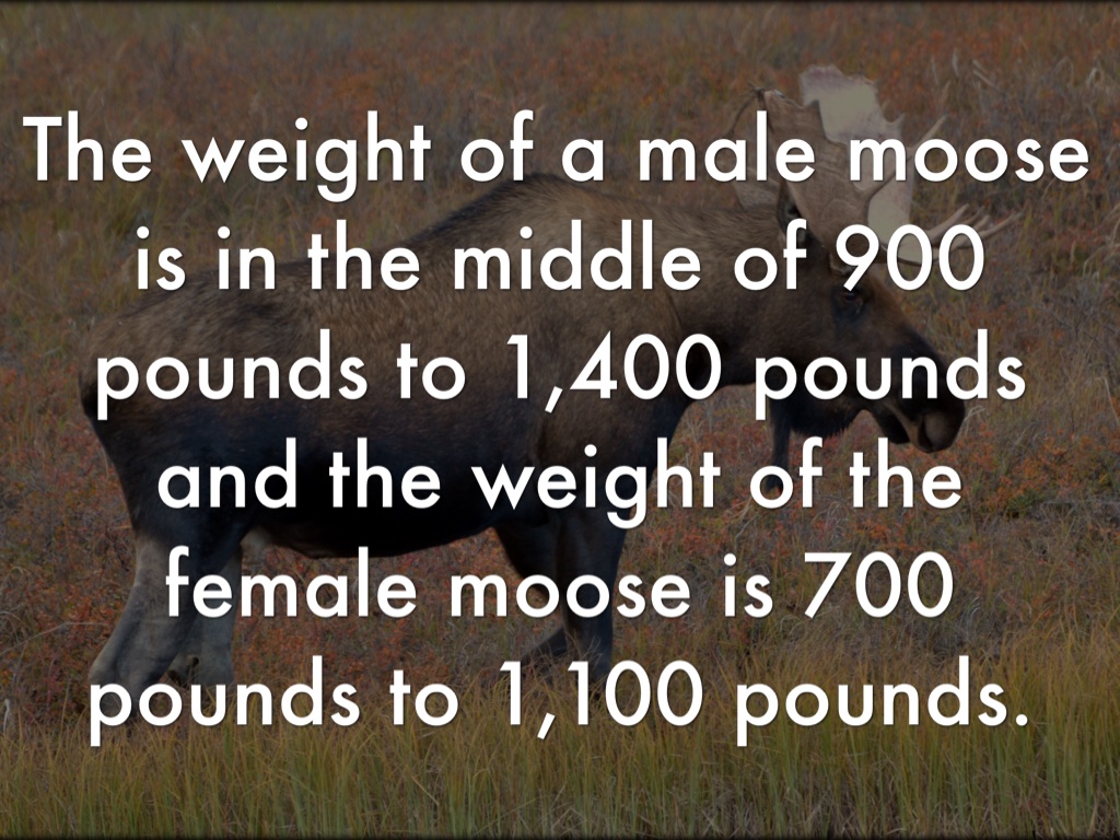 The weight of a male moose is in the middle of 900 pounds to 1,400 pounds and the weight of the female moose is 700 pounds to 1,100 pounds.