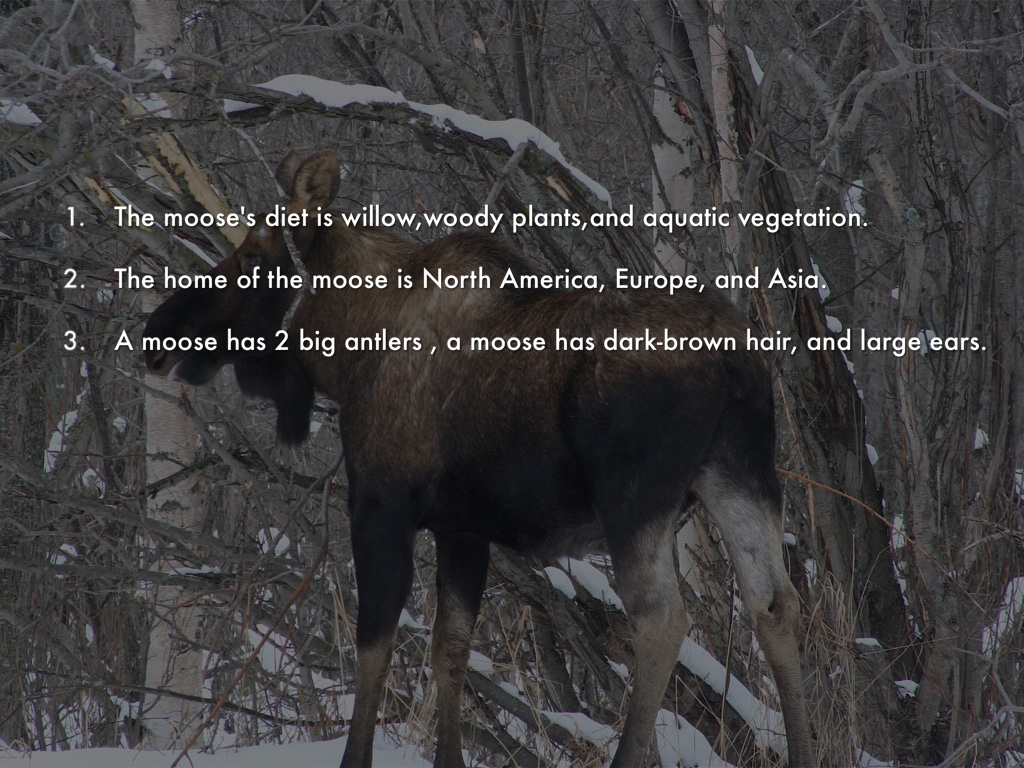The moose's diet is willow,woody plants,and aquatic vegetation.